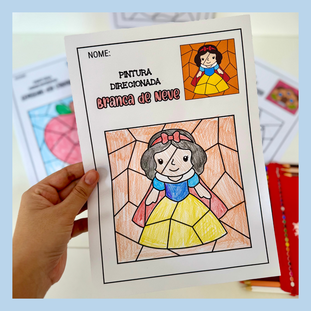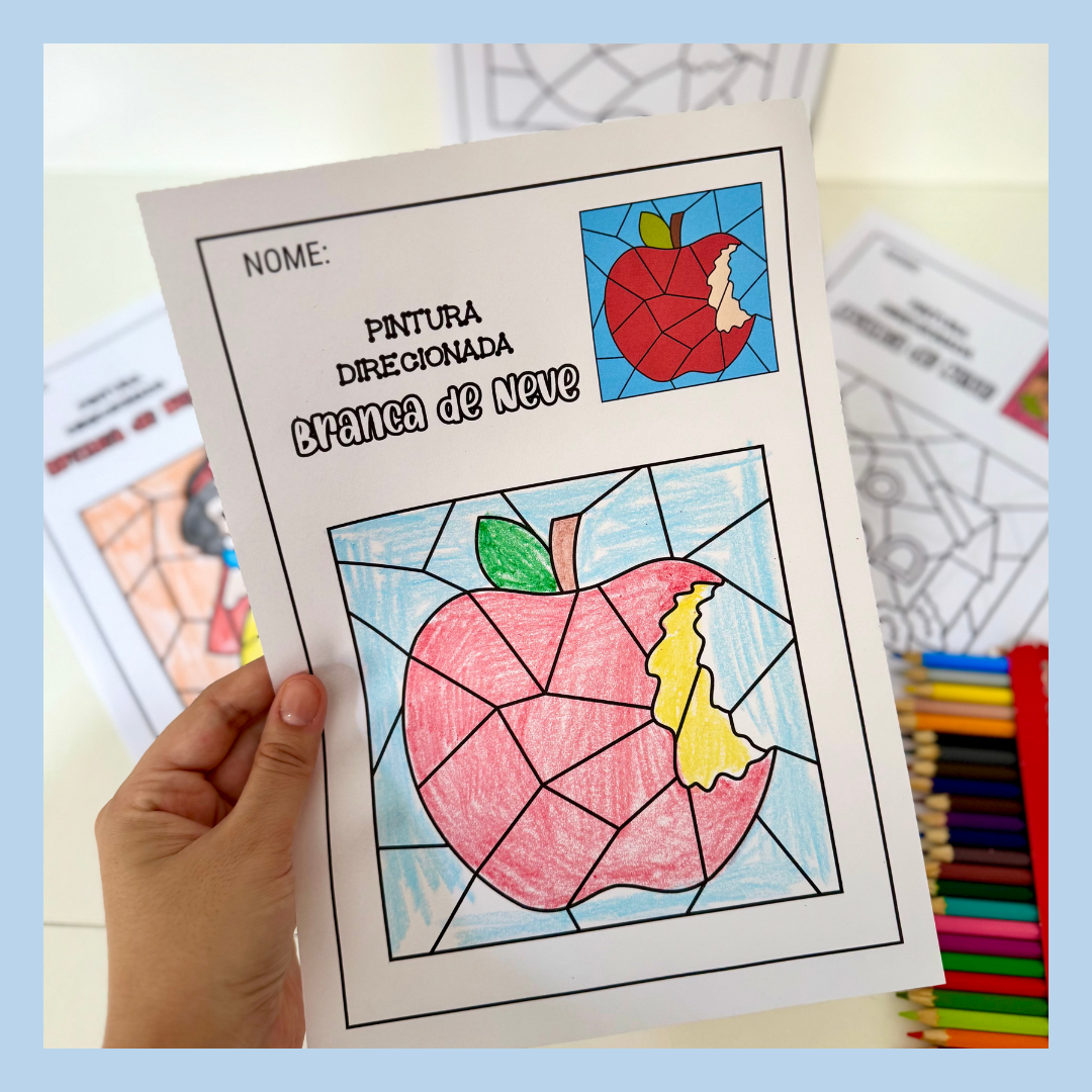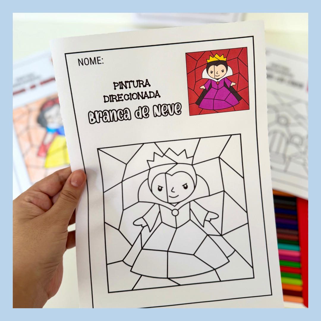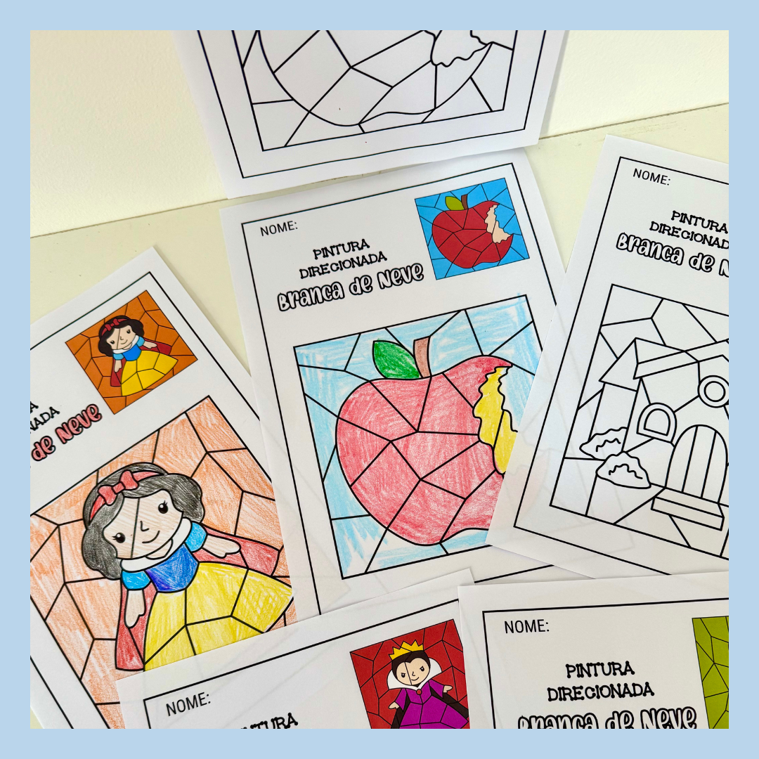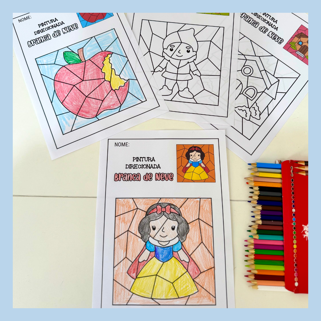 Atividades pintura direcionada tema Branca de Neve para trabalhar diversas habilidades com turmas da Educação Infantil.